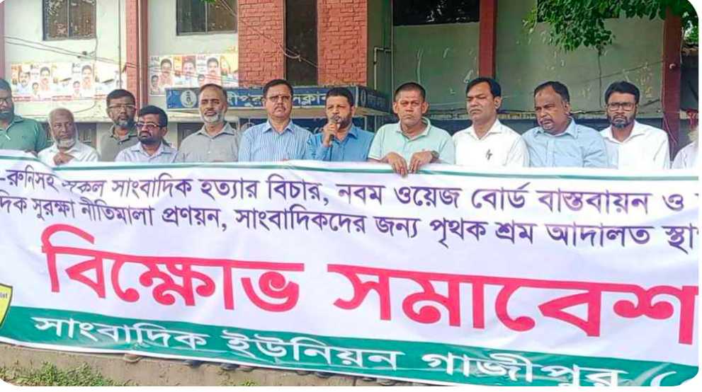 গাজীপুরে নো ওয়েজ বোর্ড নো মিডিয়া ও সাগর রুনি হত্যার বিচার সহ ২১ দফা দাবিতে বিক্ষোভ সমাবেশ অনুষ্ঠিত